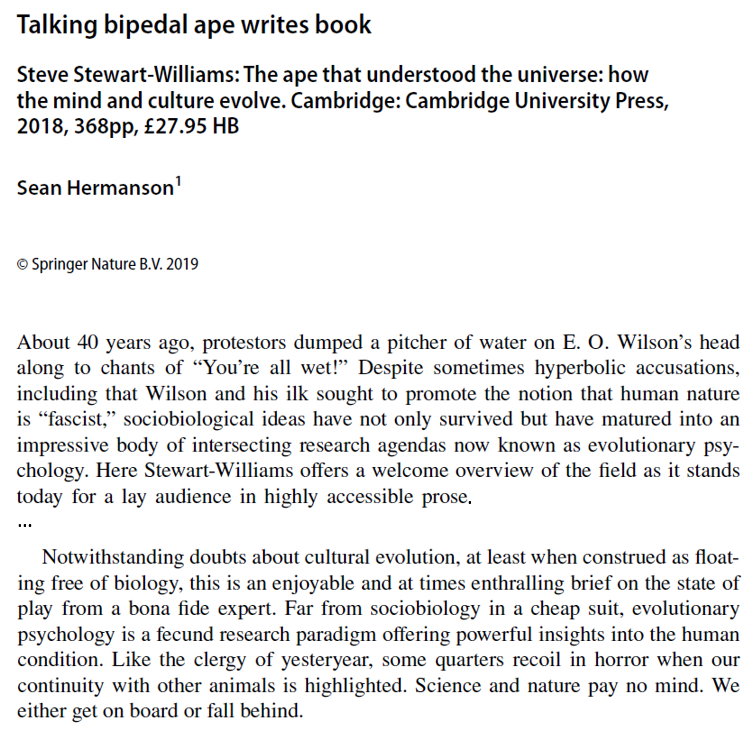 John Barry: ”The acclaim that Steve Stewart-Williams enjoys is well-deserved. He manages to write accurately and intelligently about sensitive topics that are often written about clumsily by others. The result is that many more people are open to learning from him, which is surely the aim of every educationalist.”